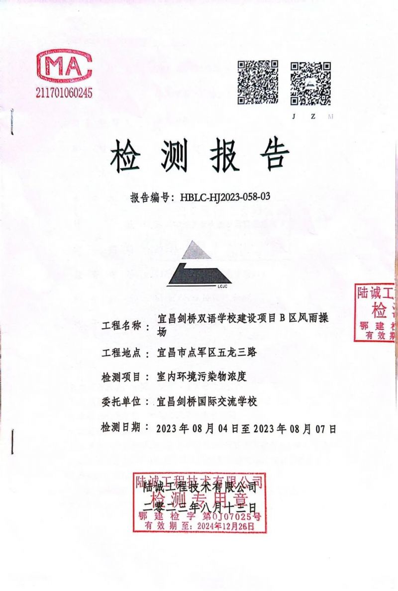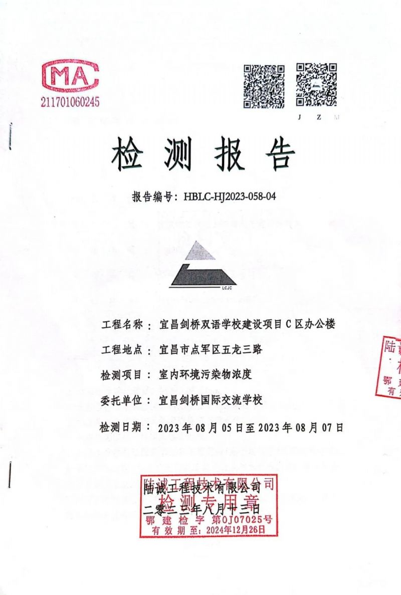 經(jīng)具有環(huán)境檢測資質(zhì)的陸誠工程技術(shù)有限公司對宜昌歐陽修學(xué)校(宜昌劍橋國際交流學(xué)校)新校建設(shè)工程進行全面檢測,學(xué)校A區(qū)學(xué)生宿舍1#樓、A區(qū)學(xué)生宿舍2#樓、B區(qū)風(fēng)雨操場、C區(qū)辦公樓、D區(qū)教學(xué)樓均已合格。