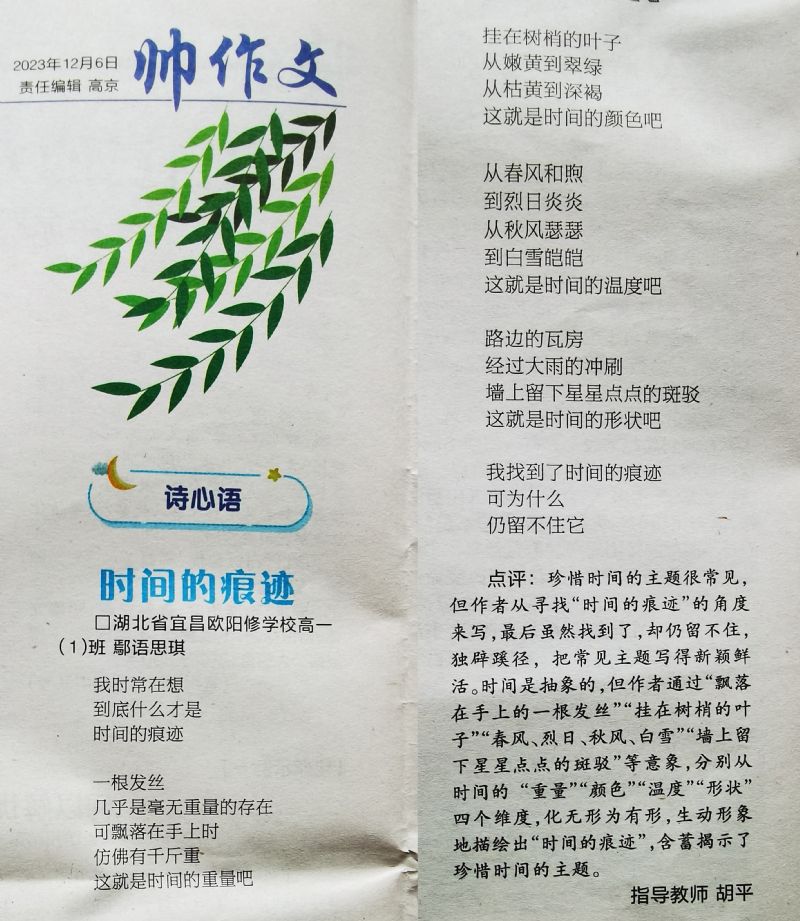 (該詩(shī)作和點(diǎn)評(píng)已在2023年12月6日的《帥作文》高中版發(fā)表,該報(bào)由人民文學(xué)出版社和湖北日?qǐng)?bào)傳媒集團(tuán)聯(lián)合主辦)