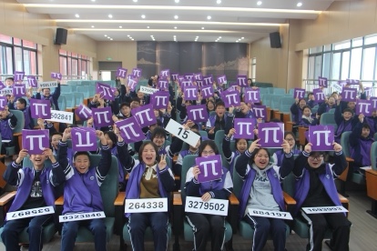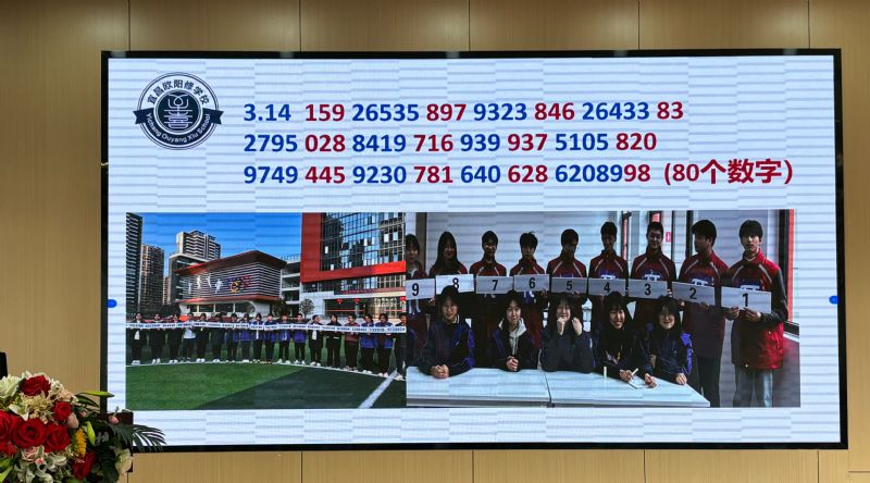 活動由國際部學生部長蔣詩語同學主持,分兩個板塊( 室內(nèi)科普活動和室外游藝活動)、三個議程:首先是室內(nèi)部分,由初二年級主任、數(shù)學老師李駿介紹π 值的演算歷史,接著由數(shù)學日活動的總策劃、國際部主任李翠銀老師介紹 International Mathematics Day 的來歷和意義,并教唱“International Mathematics Day "歌曲, 最后進入同學們搶答環(huán)節(jié)。室外操場部分,首先是由80名同學一起完成π值小數(shù)點后520位數(shù)字的接龍背誦, 然后由高一代表隊(10人)和高二代表隊(10人)比賽背誦π=3.1415926......后面130位數(shù)字, 決出勝負。