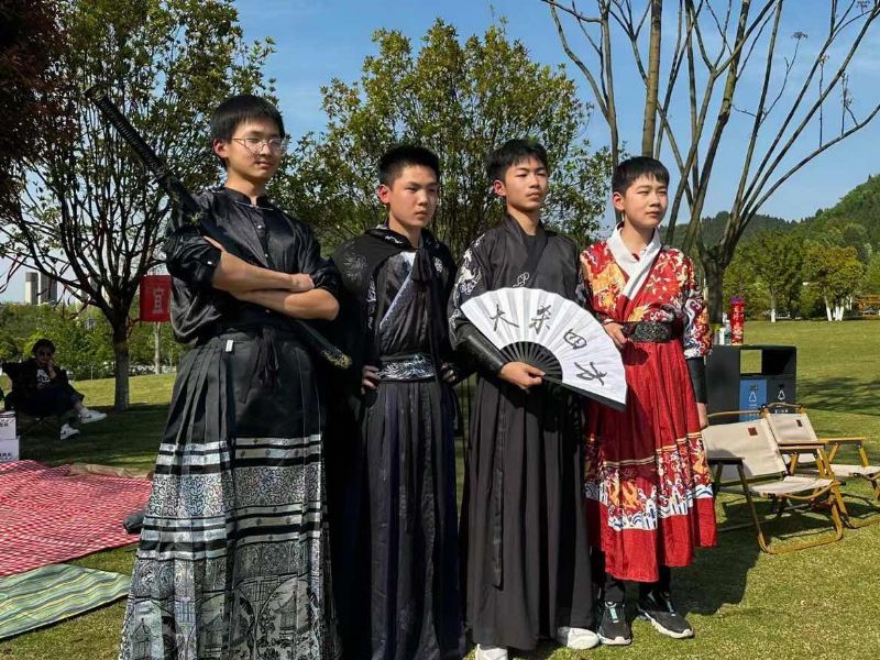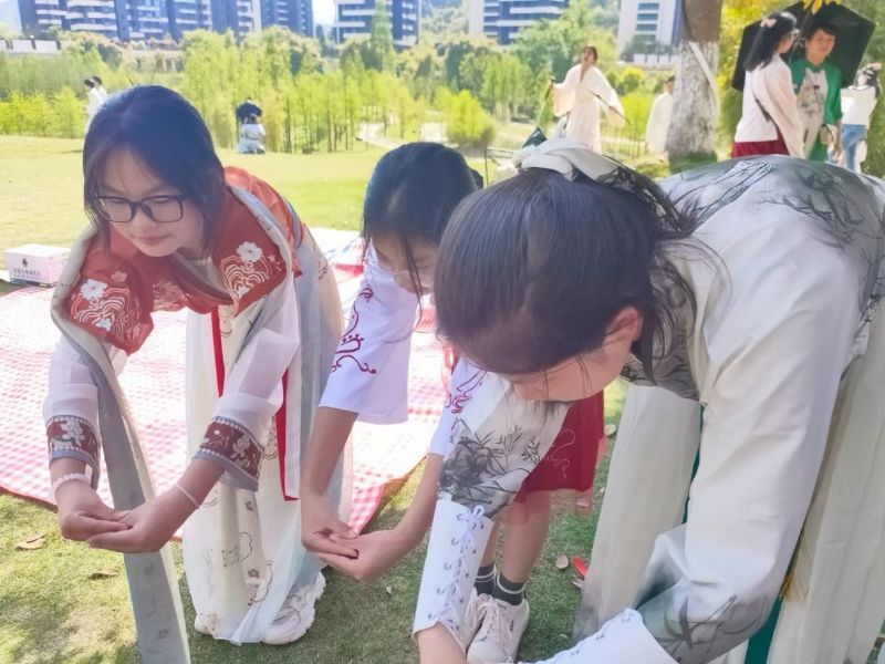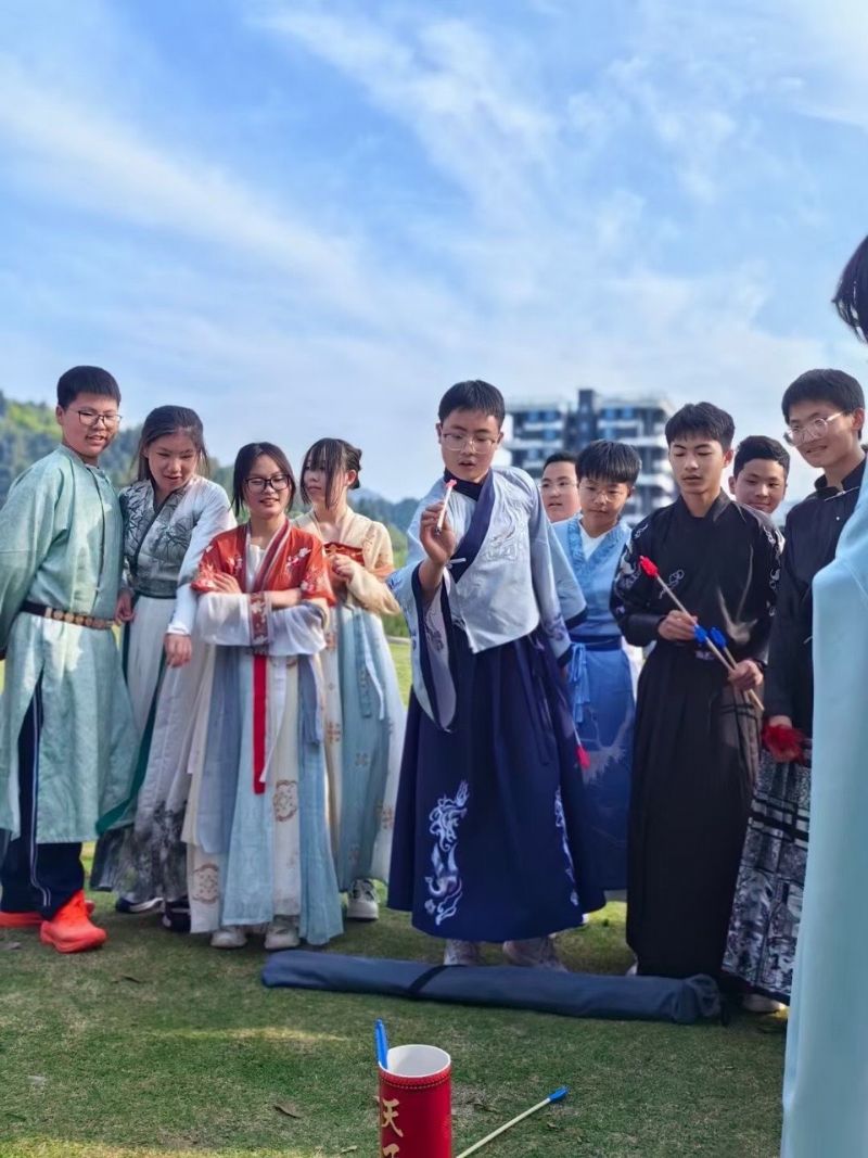 上巳正值暮春時(shí)節(jié),春天的特點(diǎn)是“生發(fā)”,所以民俗也提倡人們多活動(dòng),熱愛(ài)生命。為復(fù)原古人雅集盛況,活動(dòng)還設(shè)置了傳統(tǒng)的運(yùn)動(dòng)項(xiàng)目——踢毽子和投壺,同學(xué)們穿著漢服,雖襟飄帶舞,卻不影響其大展身手。