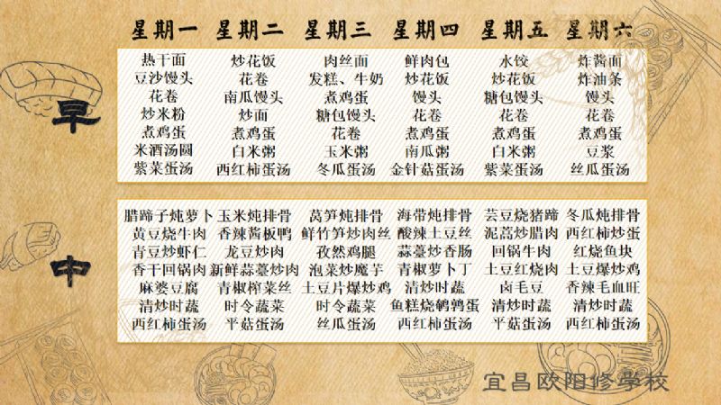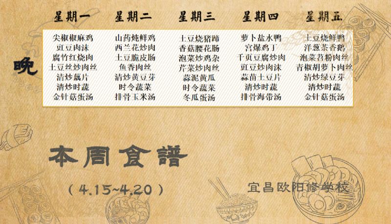 宜昌歐陽修學校每周食譜(4月15日至4月20日)