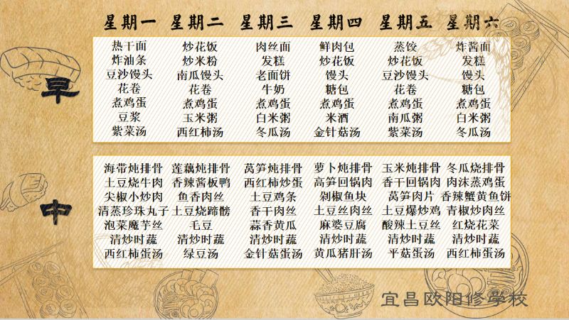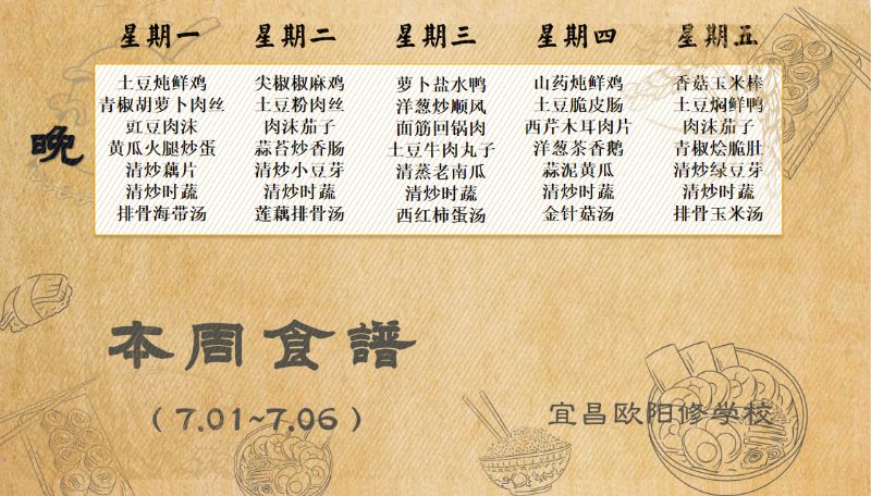 宜昌歐陽(yáng)修學(xué)校每周食譜(7月1日至7月6日)
