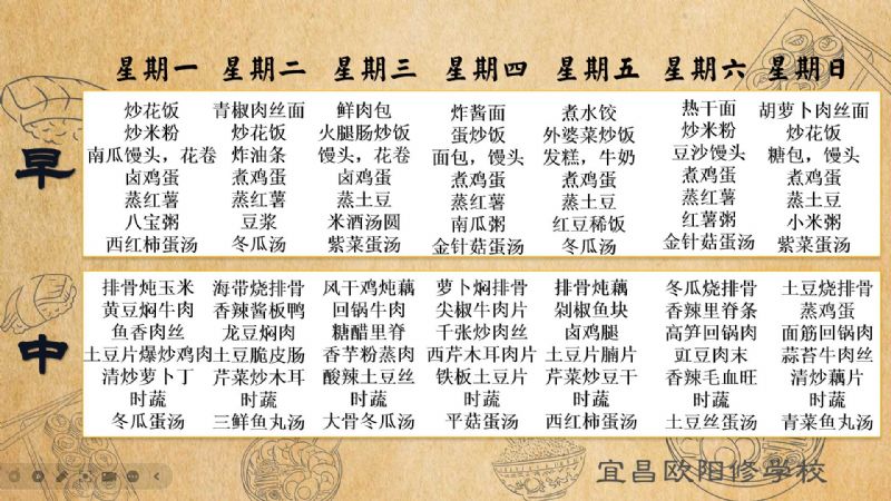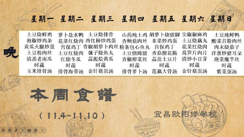 宜昌歐陽修學校每周食譜(11月4日至11月10日)