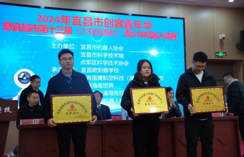 宜昌市科協(xié)副主席張翼、市科協(xié)普及部部長劉亞軍、大有國鷹航空科技(湖北)有限公司總經(jīng)理陳紹文為理事單位——宜昌鯊魚創(chuàng)客科技培訓有限公司、宜昌市樂博士機器人科技中心、宜昌優(yōu)趣科技培訓有限公司授牌。