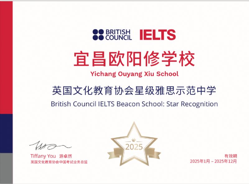 李翠銀主任說(shuō):獲此權(quán)威認(rèn)證,標(biāo)志著宜昌歐陽(yáng)修學(xué)校國(guó)際高中的雅思課程體系再次獲得了雅思考試主辦方官方認(rèn)可:①我校國(guó)際高中IELTS雅思o(jì)pen辦學(xué)特色獲得認(rèn)可②雅思高效課堂的課程體系、生動(dòng)課堂的教研質(zhì)量、工匠之心師資力量又一次獲得最權(quán)威官方肯定③學(xué)生的聽(tīng)說(shuō)讀寫(xiě)單項(xiàng)及英語(yǔ)綜合能力培養(yǎng)成果顯著。此次獲獎(jiǎng),是繼2024年1月我校被授予“雅思示范中學(xué)”和”雅思教師培訓(xùn)基地“以來(lái)再度榮獲BC官方認(rèn)可,是一個(gè)新的里程碑的開(kāi)始,我校國(guó)際高中將一如既往地依托雅思官方資源,為學(xué)生提供高質(zhì)量、高權(quán)威性的備考資源和服務(wù),為學(xué)生圓夢(mèng)海外名校保駕護(hù)航。一分耕耘一分收獲!數(shù)年的RoadtoIELTS雅思之路探索,宜昌歐陽(yáng)修學(xué)校國(guó)際高中的師生們?cè)贗ELTS雅思課程教學(xué)及考試方面投入了大量精力,也取得了優(yōu)異成績(jī),教學(xué)教研效果以及專(zhuān)業(yè)師資團(tuán)隊(duì)的敬業(yè)精神能再次獲得BC英國(guó)文化教育協(xié)會(huì)的認(rèn)可,被授予年度星級(jí)雅思示范中學(xué)(宜昌市唯一、湖北省僅3所學(xué)校),是值得驕傲和自豪的。因?yàn)椤靶羌?jí)雅思示范中學(xué)”評(píng)選條件十分嚴(yán)格,一是雅思課程的教學(xué)質(zhì)量和考生數(shù)量及成績(jī)均達(dá)到英國(guó)文化教育協(xié)會(huì)的規(guī)定標(biāo)準(zhǔn),二是在評(píng)選過(guò)程中,英國(guó)文化教育協(xié)會(huì)還會(huì)專(zhuān)門(mén)組織團(tuán)隊(duì)深入各候選學(xué)校,全面評(píng)估雅思課程的實(shí)施狀況及學(xué)生綜合表現(xiàn)。
